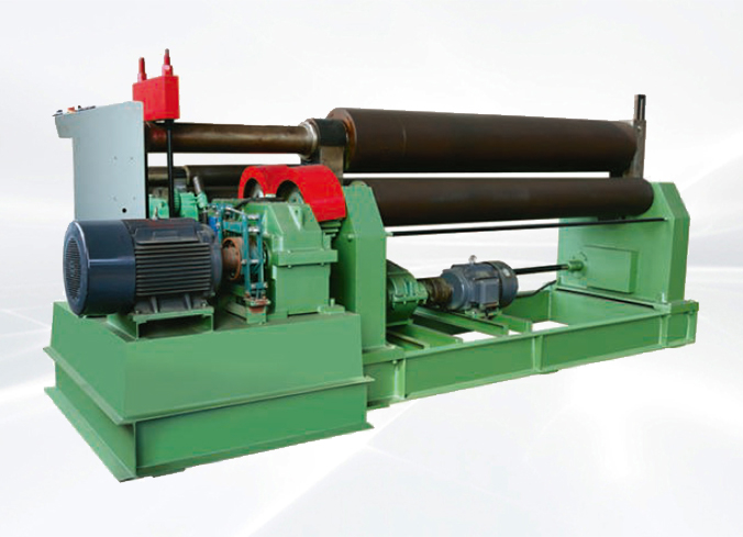 該機結構型式為三輥非對稱式,下輥為主傳動,并做垂直升降運動,以便夾緊板材。通過下輥齒輪與上輥齒輪嚙合,同時作為主傳動,側作傾升降運動。具有預彎、卷圓多重功能,結構緊湊操作維修方便