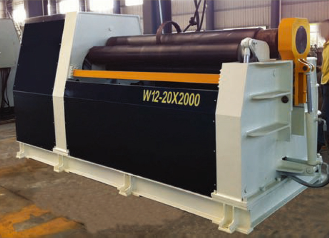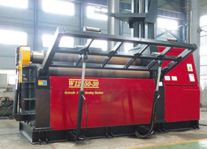 本機結構型式為三錕對稱式,上輥在兩下輥中央對稱位置作垂直升降運動,通過液壓缸內的液壓油作用于活塞而獲得,為液壓傳動;兩下作旋轉運動,通過減速機的輸出齒輪與下輥齒輪嚙合為卷制板材提供扭矩。本機床結構緊,操作維修方便。
