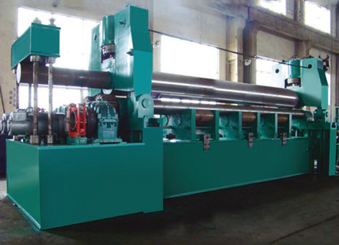 該機結構型式四輥式,上輥為主傳動,通過減速機的輸出齒輪與上輥齒輪嚙合,為卷制板材提供扭矩;下輥作垂直升降運動,通過液壓缸內的液壓油作用于活塞而獲得,以便夾緊板材,為液壓傳動;在下輥的兩側設有側輥并沿著機架導軌作傾運動,通過絲桿絲母蝸輪蝸桿傳動;該機優點是板材端部預彎及卷圓可以在同一臺設備上進行。